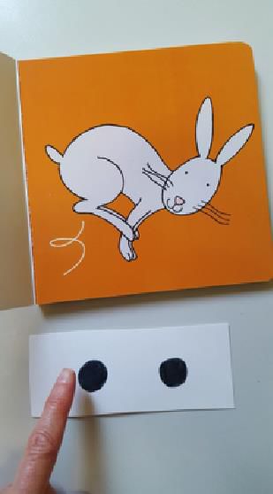 Immaginiamo, ad esempio, di sfogliare insieme un libretto e teniamo a disposizione il cartoncino. Ad ogni pagina diamo il tempo al bambino di guardare e magari di usare una delle sue paroline in riferimento a quello che vede, es. Salta!. Noi espandiamo quello che lui dice ripetendo la sua parola e combinandola con un’altra adeguata all’immagine del libro.